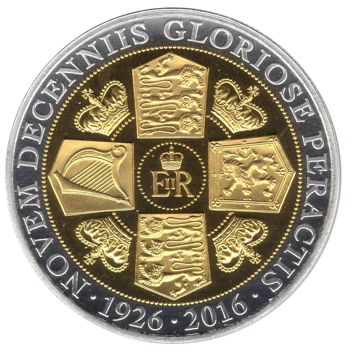 Shields of England and Wales with three lions, a Scottish lion rampant, and an Irish harp. The quadrants show St Edward's Crown encircled by a Latin inscription.