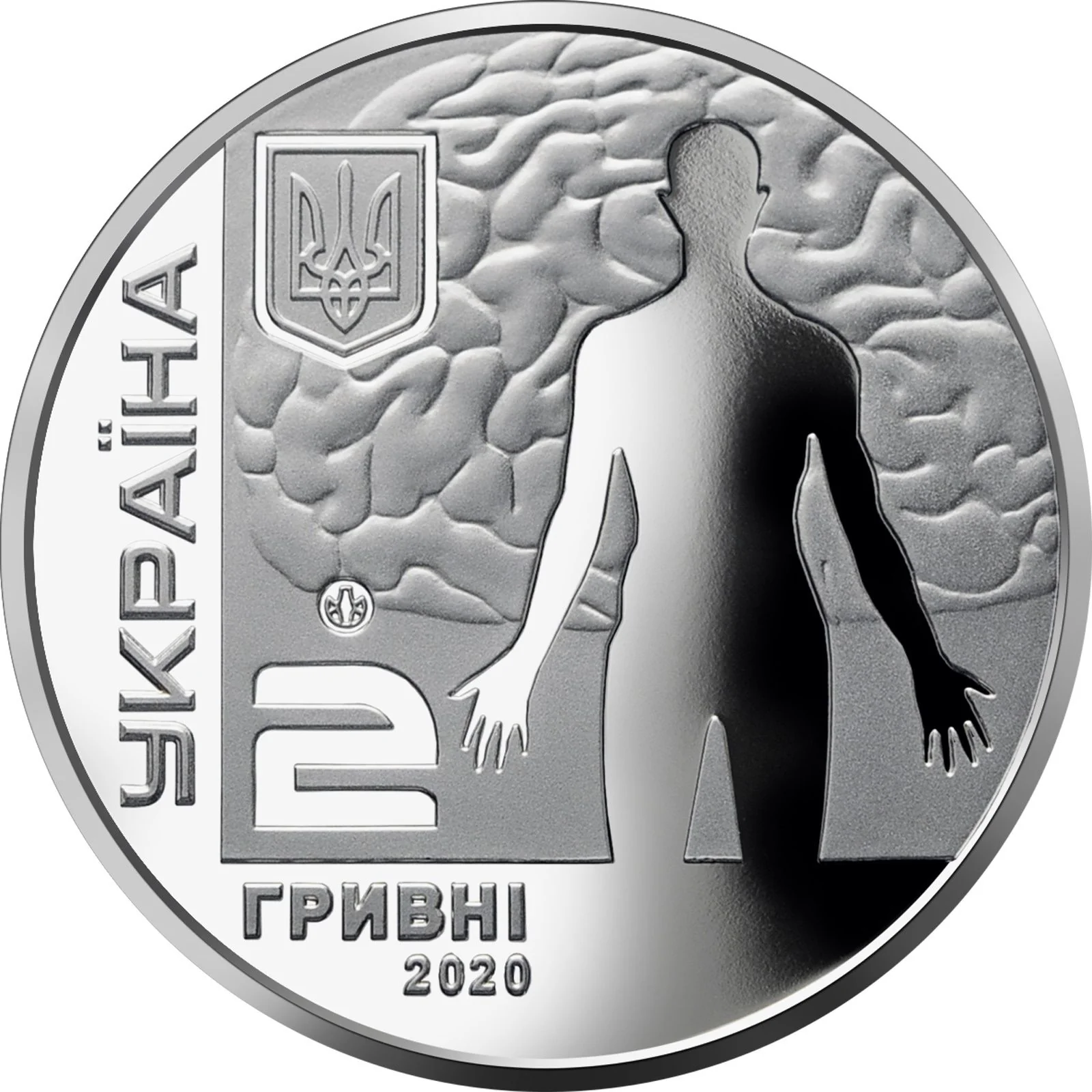 Left, Ukraine's small coat of arms on a relief background; right, a smooth human outline against a stylized brain. Below: 2/ГРИВНІ/2020. Left, vertically: УКРАЇНА. Above the value, the NBU mint mark.