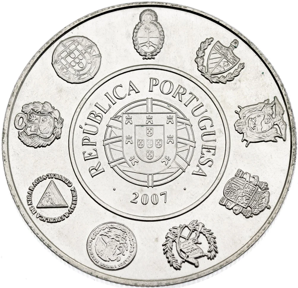 Portuguese coat of arms surrounded by those of Argentina, Cuba, Ecuador, Spain, Guatemala, Mexico, Nicaragua, and Peru.