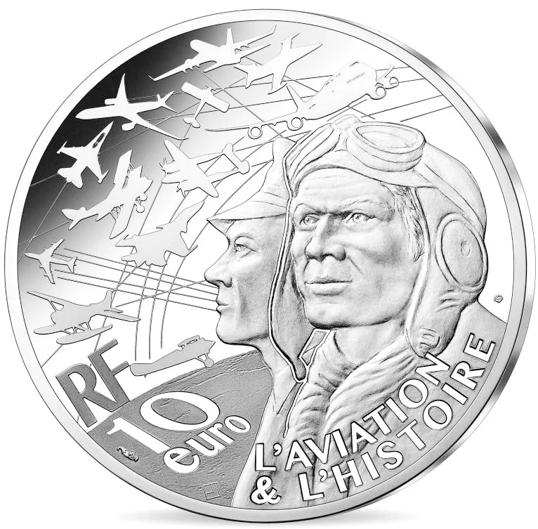 Two pilots embody civil and military aviation across eras, with diverse aircraft filling the sky in tribute to flight history. The reverse features the face value and "RF" symbol.