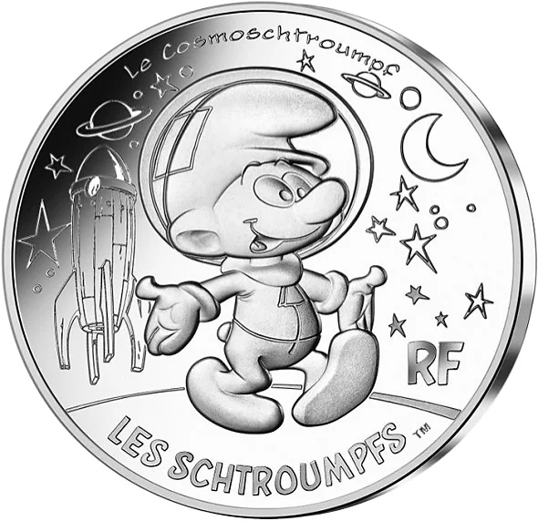 "10 EURO" flanked by laurel and oak branches, encircled by "RÉPUBLIQUE FRANÇAISE" and three hexagons.
