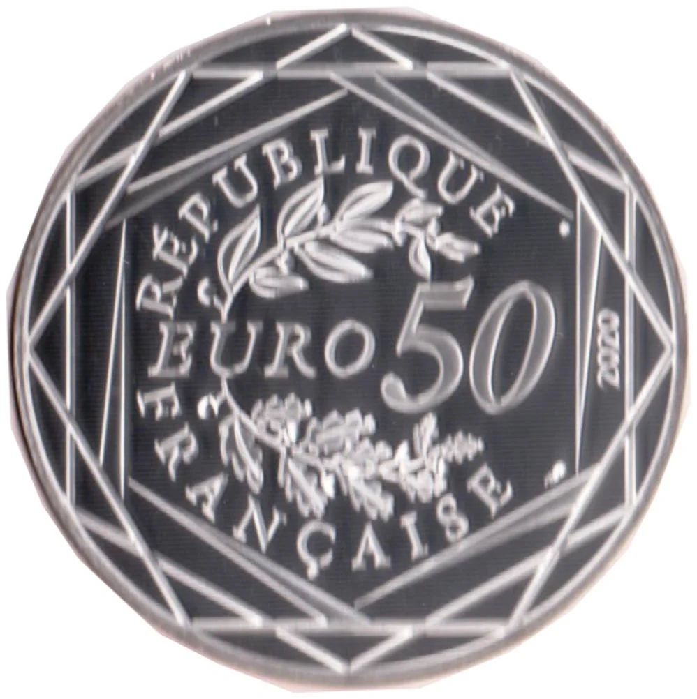 "50 EURO" flanked by laurel and oak branches, encircled by "RÉPUBLIQUE FRANÇAISE" and three hexagons.