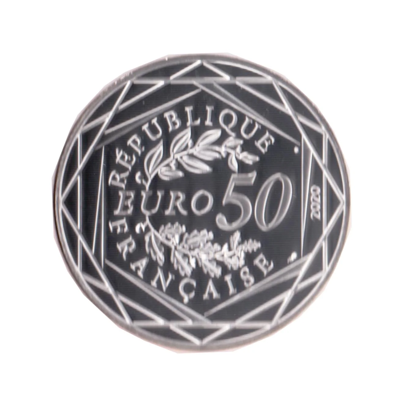 "50 EURO" flanked by laurel and oak branches, encircled by "RÉPUBLIQUE FRANÇAISE" and three hexagons.