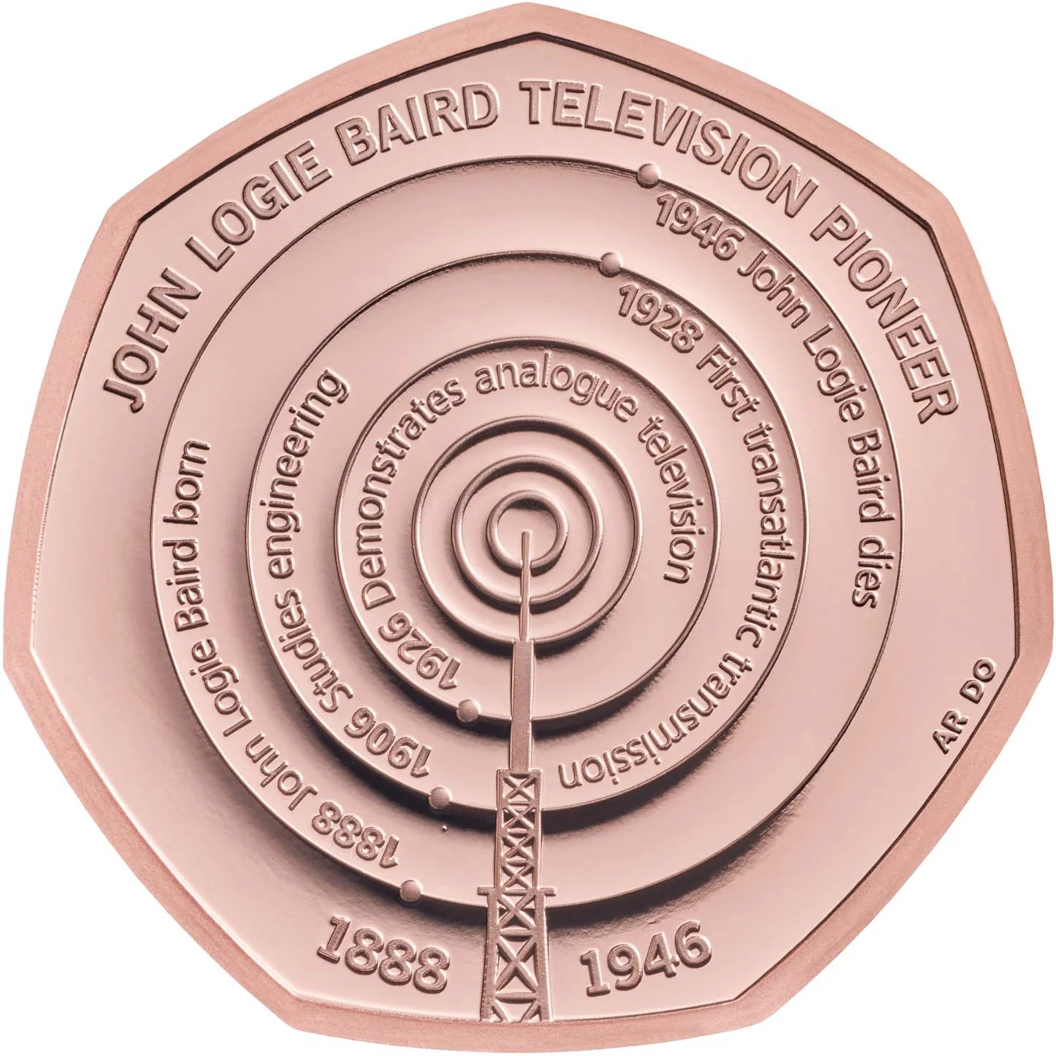 A TV mast emitting radio waves, flanked by John Logie Baird's birth and death years: 1888 and 1946.