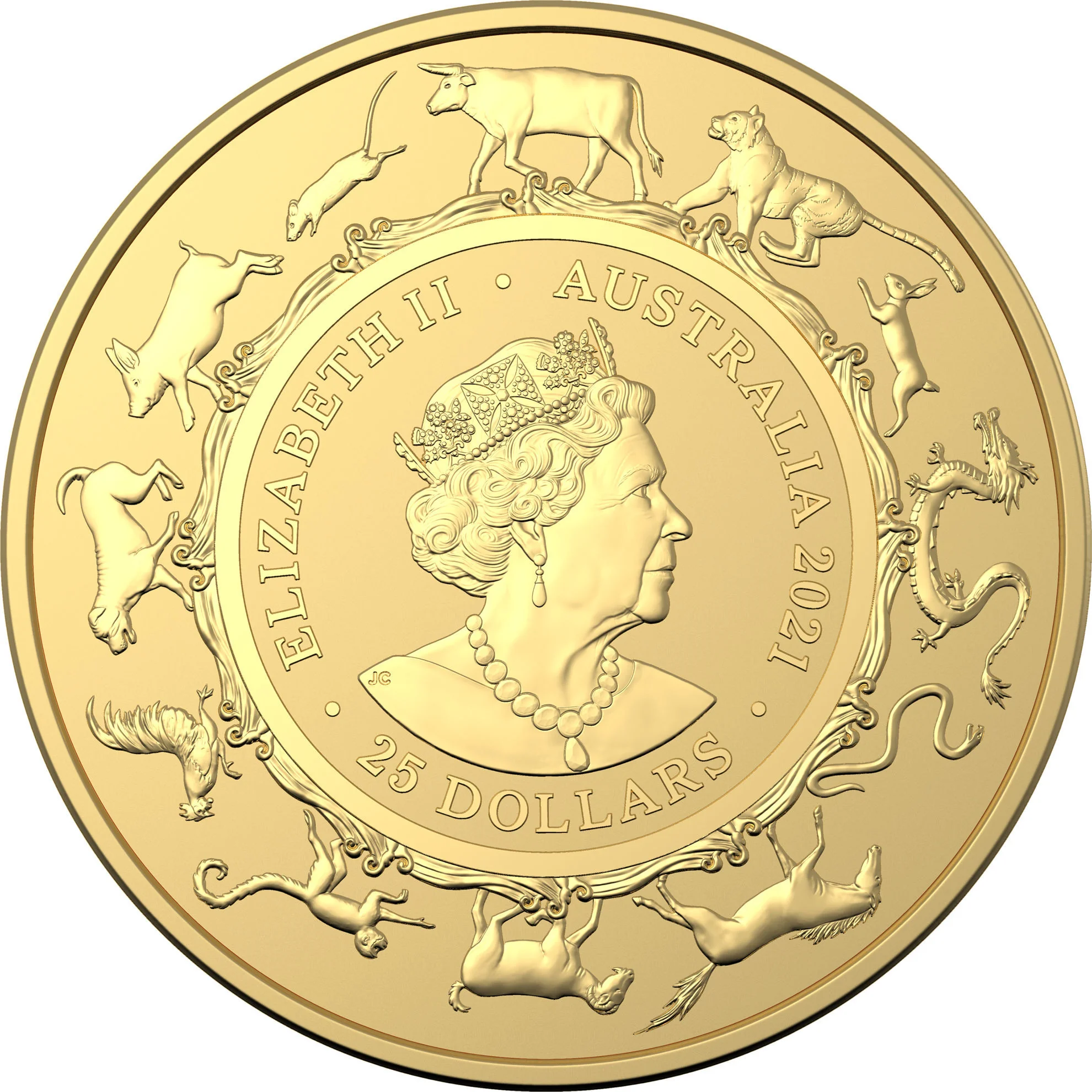 Sixth crowned portrait of Queen Elizabeth II facing right, wearing the George IV State Diadem and Victorian Coronation Necklace, encircled by the Chinese zodiac race.