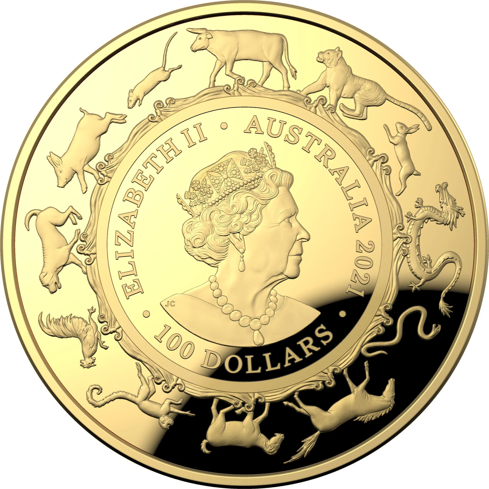 Sixth crowned portrait of Queen Elizabeth II facing right, wearing the George IV State Diadem and Victorian Coronation Necklace, encircled by the Chinese zodiac race.