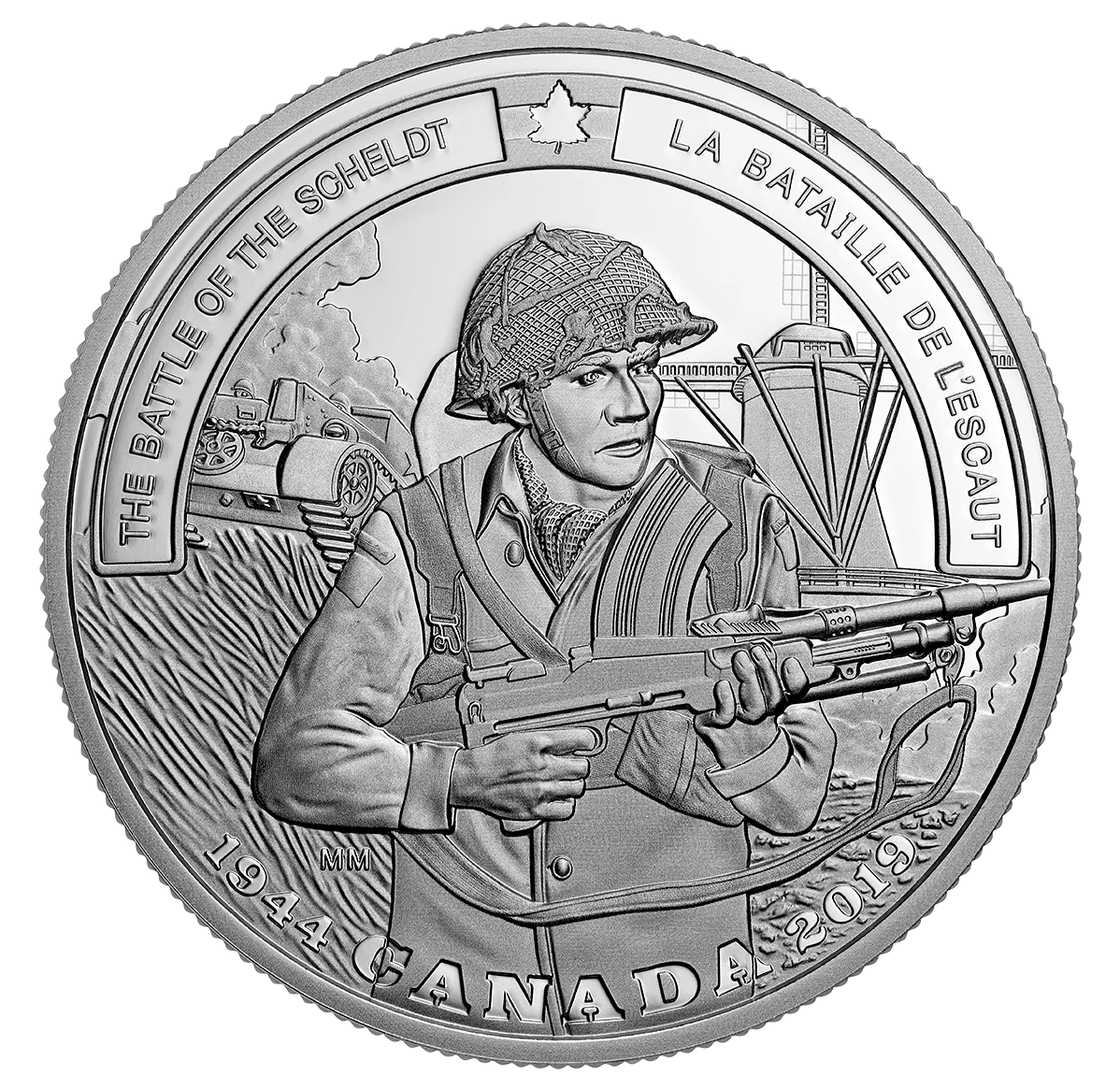 A Canadian Ojibwa soldier with a Bren gun advances past a tower mill in 1944, supported by a Wasp flamethrower carrier on an embankment near the Scheldt River. The First Canadian Army insignia is visible.