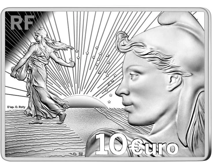 The foreground features Rosalinda Pesce, the model for Oscar Roty's engraving, appearing on a coin for the first time. Behind her is the original Sower from the 1898 1 franc coin. Twenty stars represent years, while the sun nods to the former Franc currency. The heraldic ground symbolizes the French flag: blue with horizontal lines, white with the flat band, and red with vertical lines.