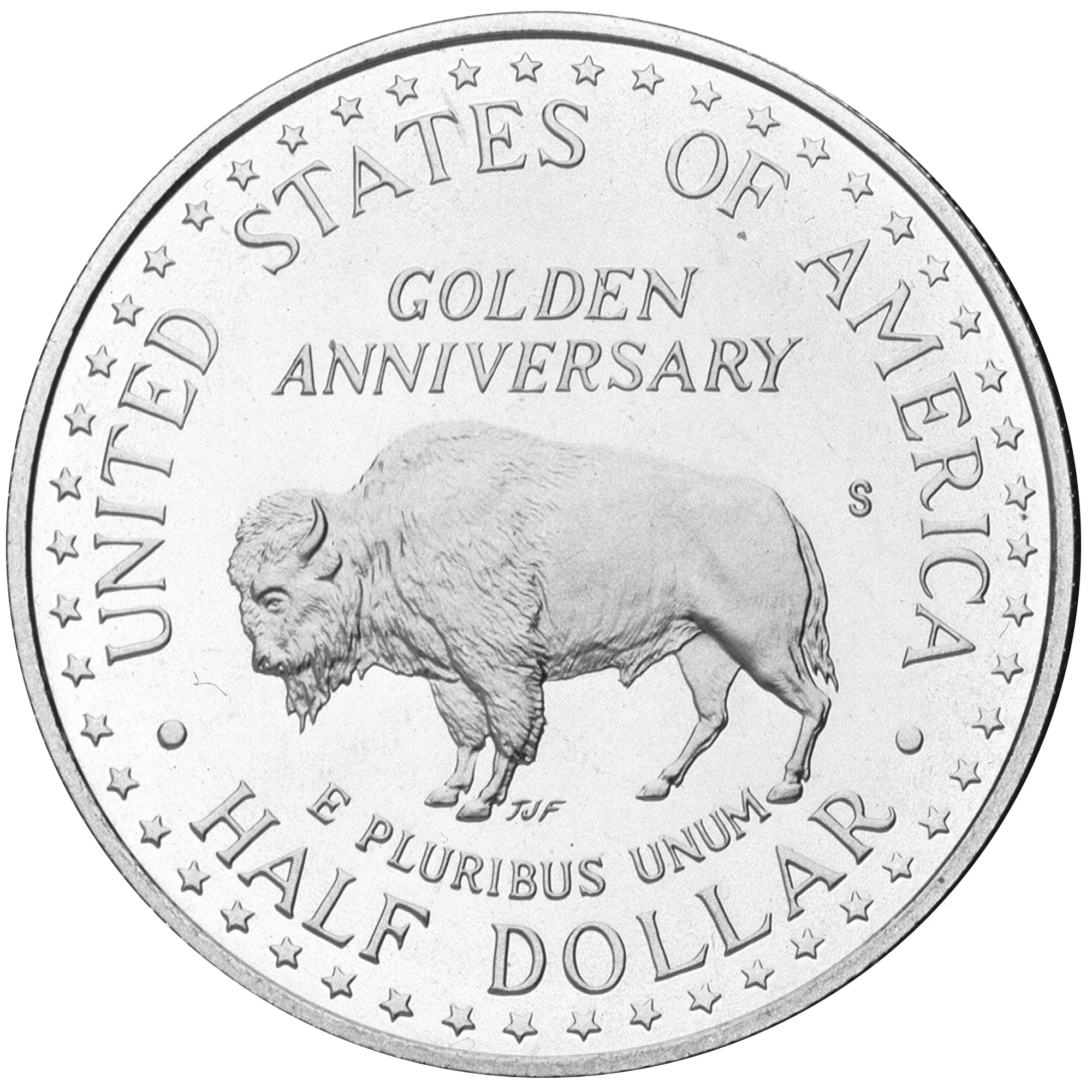American Bison, often called buffalo, with fifty stars encircling the coin.
