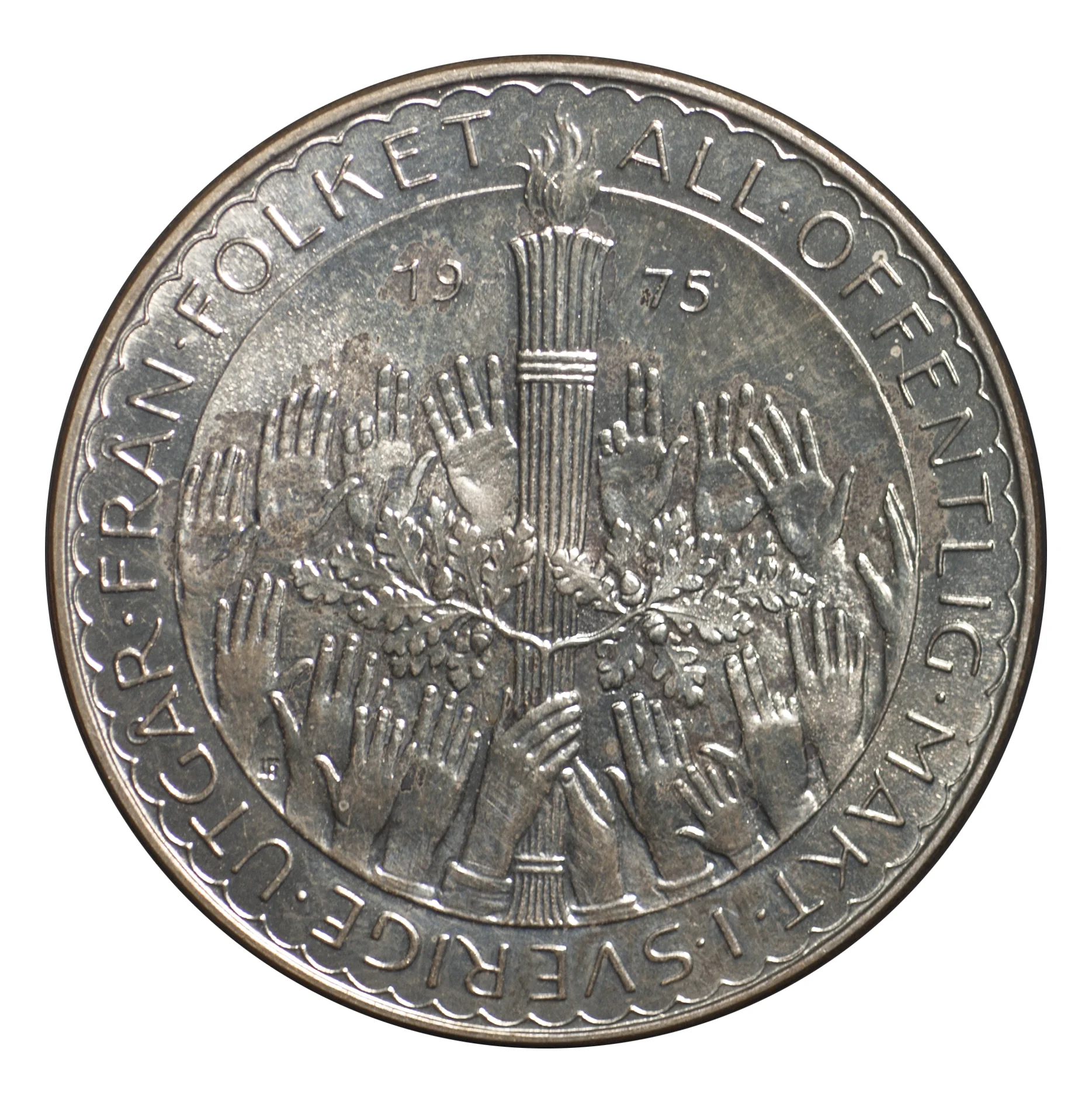 Flaming torch with oak leaves divides date; open hands reach for it below and at sides. Legend in outer ring.