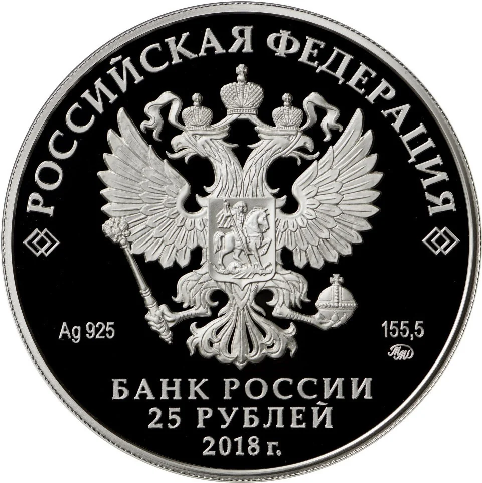 The obverse features the State Coat of Arms of the Russian Federation, inscriptions for "RUSSIAN FEDERATION," "BANK OF RUSSIA," "25 ROUBLES," "2018," metal specifications, mint mark, and fine metal content.