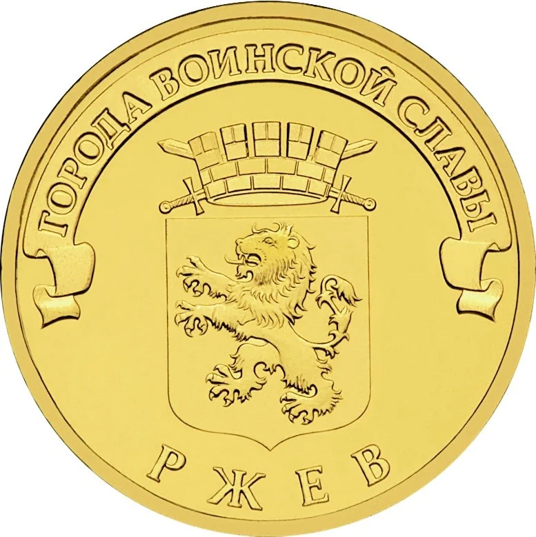 The coat of arms of Rzhev, above it on a ribbon: "ГОРОДА ВОИНСКОЙ СЛАВЫ", below on the rim: "РЖЕВ".