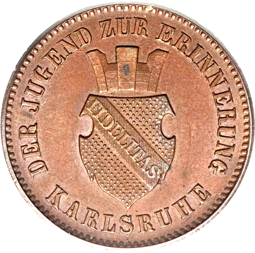 Karlsruhe's Baden coat of arms with "FIDELITAS," commemorating victory over France.