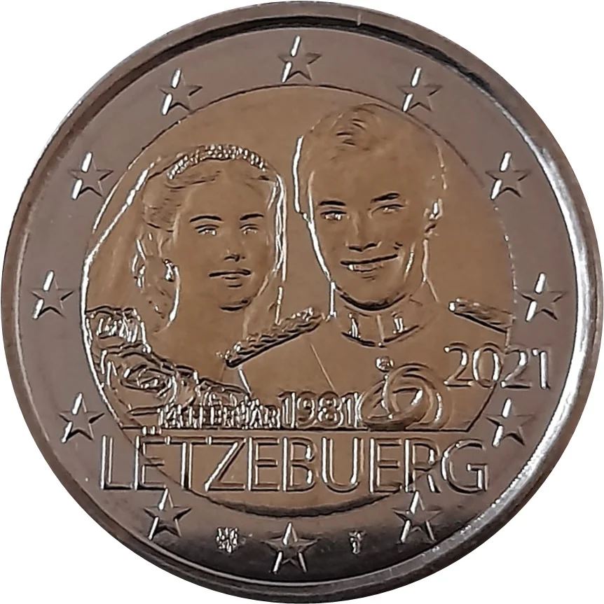 The design features effigies of Grand Duke Henri and Grand Duchess Maria Teresa. Below are two wedding rings, the date ‘14. FEBRUAR 1981’, and the year ‘2021’. ‘LETZEBUERG’ appears at the bottom. The outer ring bears the 12 stars of the European flag.