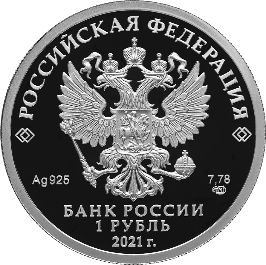 The disc's mirror field features the Russian Federation coat of arms in relief. Above it, along the rim, is the semicircular inscription "РОССИЙСКАЯ ФЕДЕРАЦИЯ," flanked by doubled rhombuses. Below the coat of arms are the metal/fineness on the left and the fine weight/mint mark on the right. Centered at the bottom, in three lines, are the inscriptions "БАНК РОССИИ," "1 РУБЛЬ," and "2021 г."
