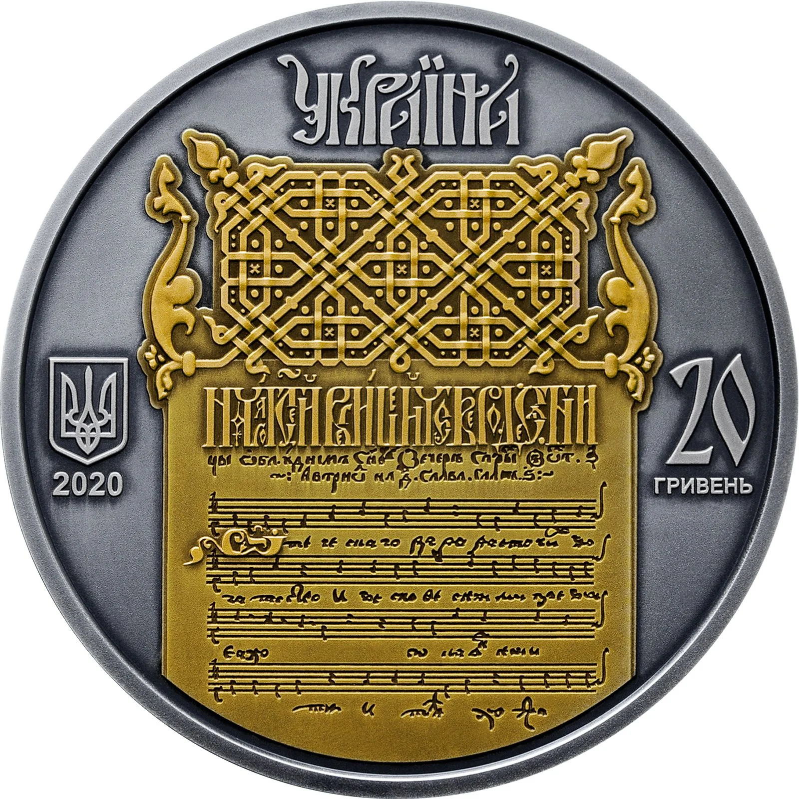 The legend УКРАЇНА appears above a gold-plated page from the Suprasl Irmologion (1598–1601), the oldest notated manuscript of Kyiv chant. To the left is Ukraine's small coat of arms and the year 2020; to the right is the face value 20 ГРИВЕНЬ.