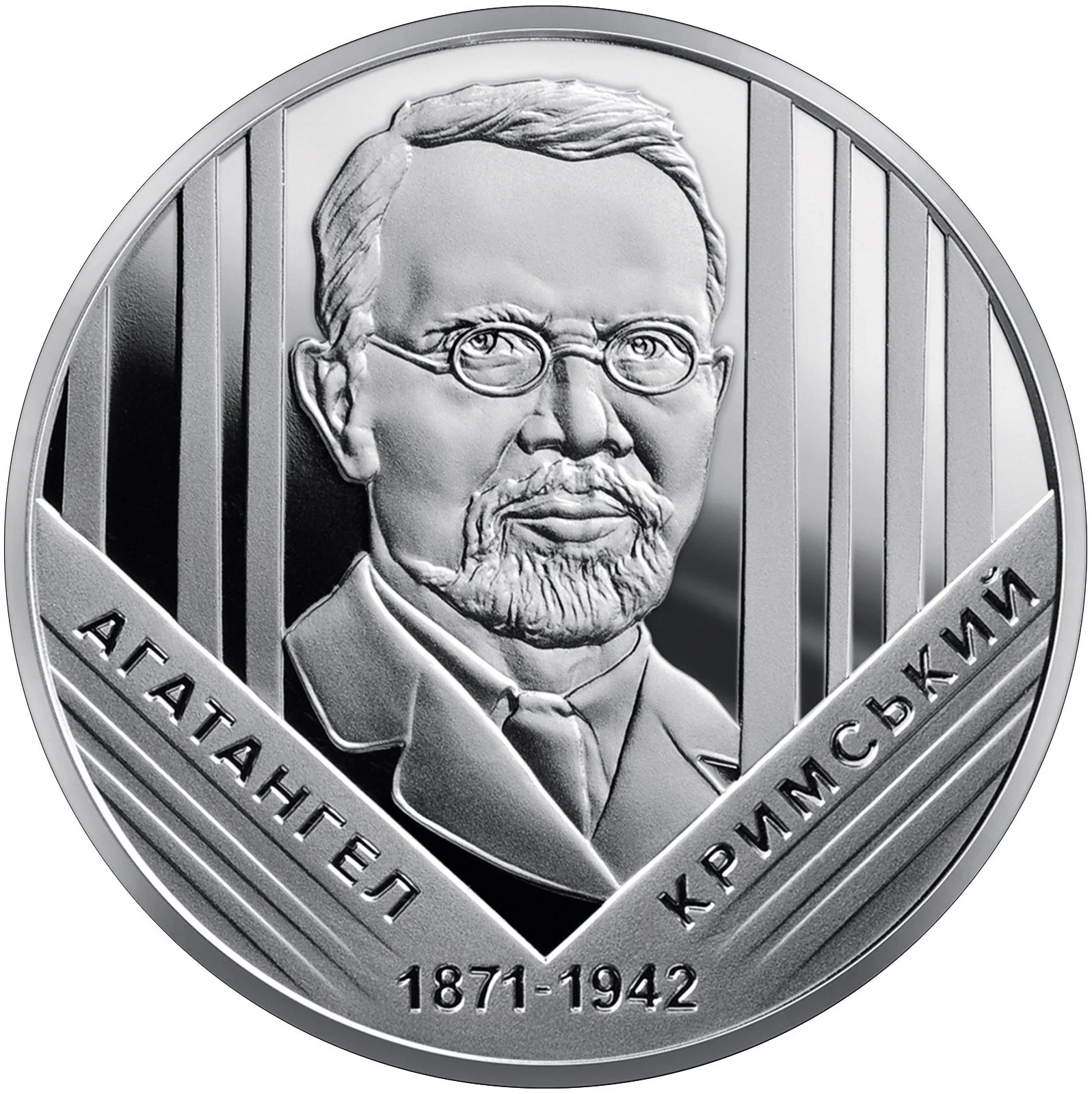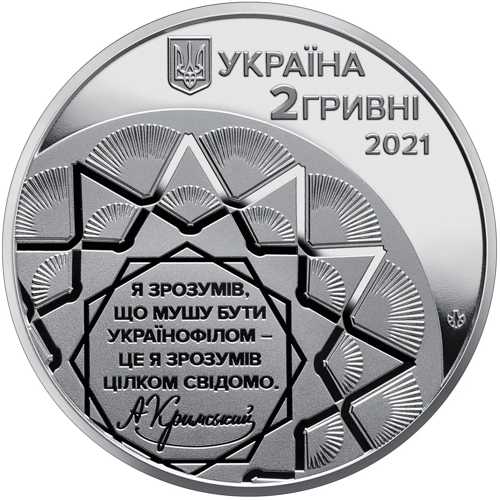 Ukraine’s small coat of arms is above the legend УКРАЇНА/2 ГРИВНІ/2021. A geometric star of open books symbolizes the scholar’s knowledge, centered on Krymsky’s quote: “Я ЗРОЗУМІВ,/ ЩО МУШУ БУТИ/ УКРАЇНОФІЛОМ –/ ЦЕ Я ЗРОЗУМІВ/ ЦІЛКОМ СВІДОМО.” Below are his facsimile and the NBU mint mark.