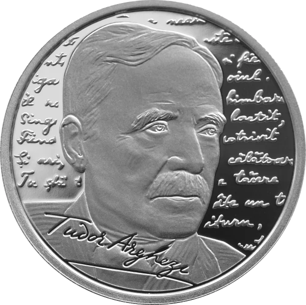 Tudor Arghezi's portrait and signature overlaid on a fragment of his manuscript.