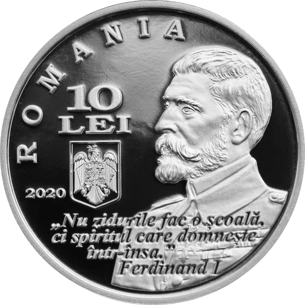 Description: King Ferdinand I’s portrait, his quote “Nu zidurile fac o școală, ci spiritul care domnește într-însa,” the arched inscription “ROMANIA,” issue year “2020,” face value “10 LEI,” and Romania’s coat of arms.
