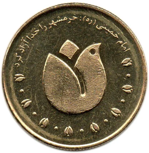 Imam Khomeini (r.i.p.): "God liberated Khorramshahr." The motif combines a tulip (martyrdom) and a pigeon (freedom). Eight tulips represent the eight-year war.