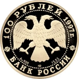 I. Bilibin's two-headed eagle design. Rim inscriptions: top—"100 РУБЛЕЙ 1997" (100 ROUBLES 1997), bottom—"БАНК РОССИИ" (BANK OF RUSSIA). Letters below denote the metal, fineness, weight, and mint mark.