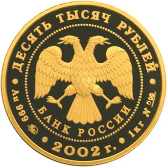 Center: Bank of Russia emblem (two-headed eagle, wings down, with "БАНК РОССИИ") within a dotted circle. Above: "ДЕСЯТЬ ТЫСЯЧ РУБЛЕЙ". Below left: metal, fineness, mint mark; center: "2002 г."; right: fine weight and coin number.