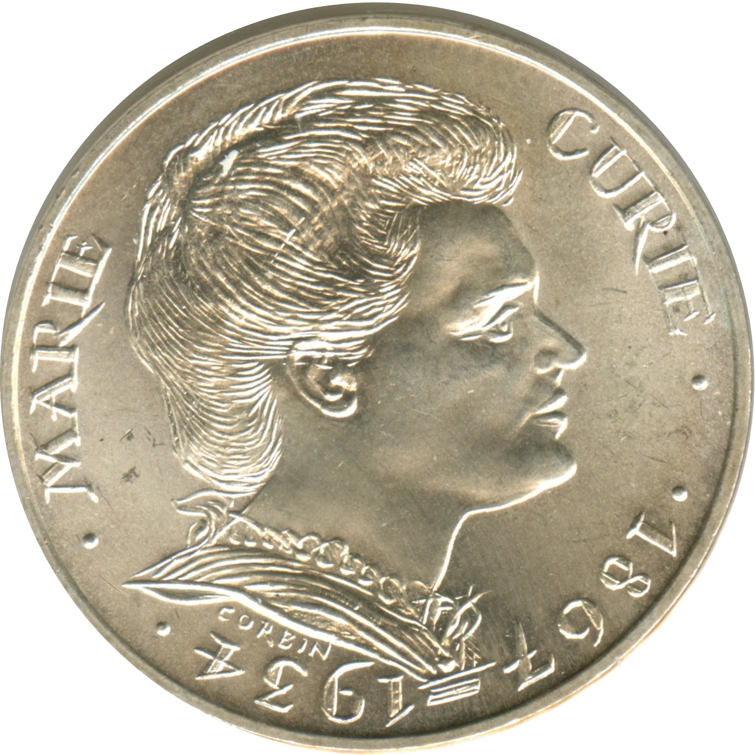 Marie Curie portrait in right profile, encircled by "• MARIE CURIE • • 1867 - 1934 •".