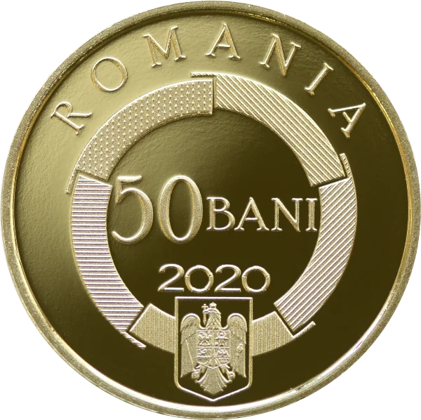 Logo of the Organisation internationale de la Francophonie, "ROMANIA" in an arc, Romanian coat of arms, face value "50 BANI", and year "2020".