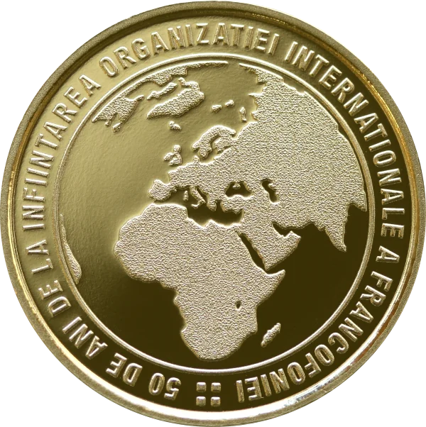 A globe symbolizing the French language's universality, encircled by the text: “50 DE ANI DE LA INFIINTAREA ORGANIZATIEI INTERNATIONALE A FRANCOFONIEI”.