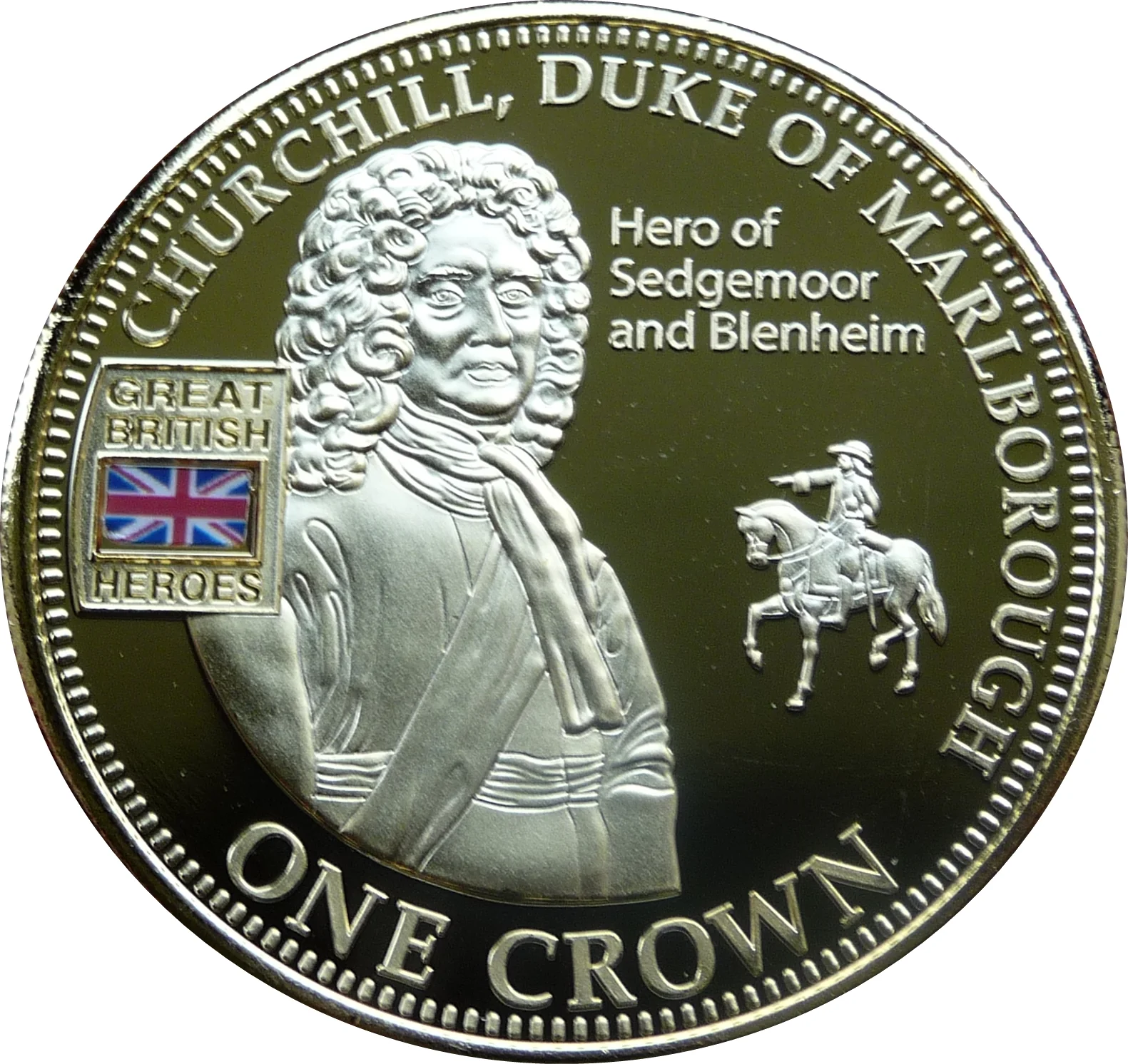 Churchill, Duke of Marlborough on horseback, with flag and value.