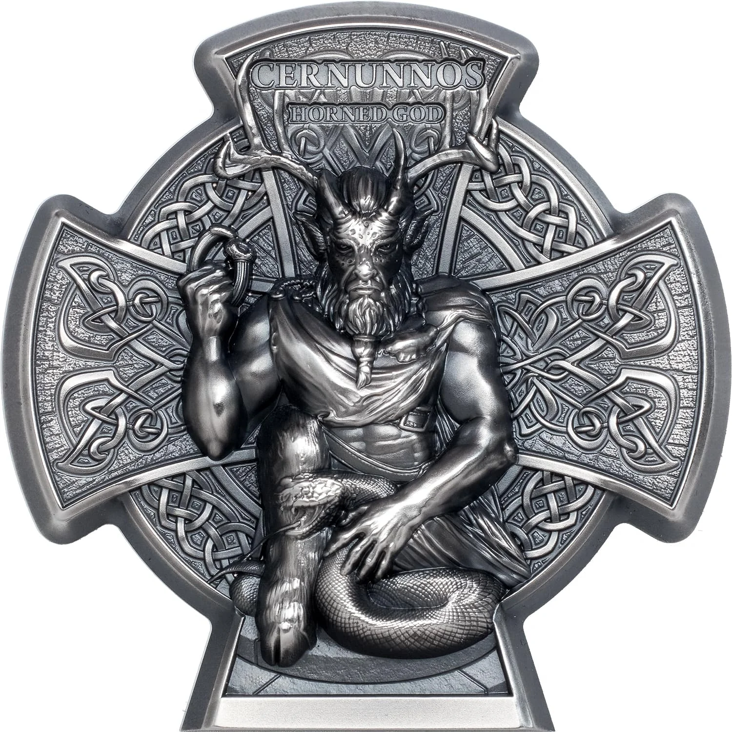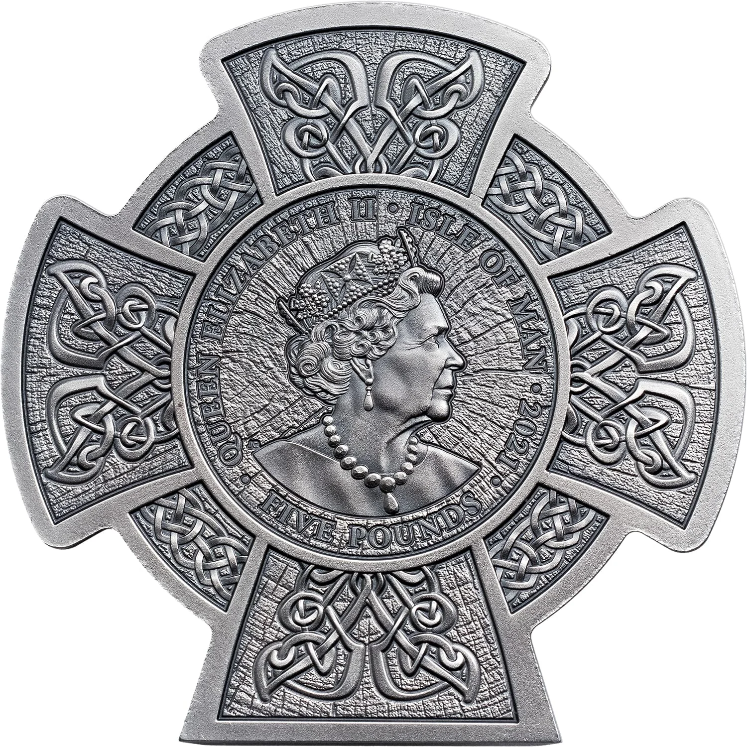 Center: Bust of Queen Elizabeth II facing right, wearing the George IV State Diadem and Victorian Coronation Necklace, surrounded by legend and date, with denomination below. Outer ring and cross arms feature geometric Viking motifs.