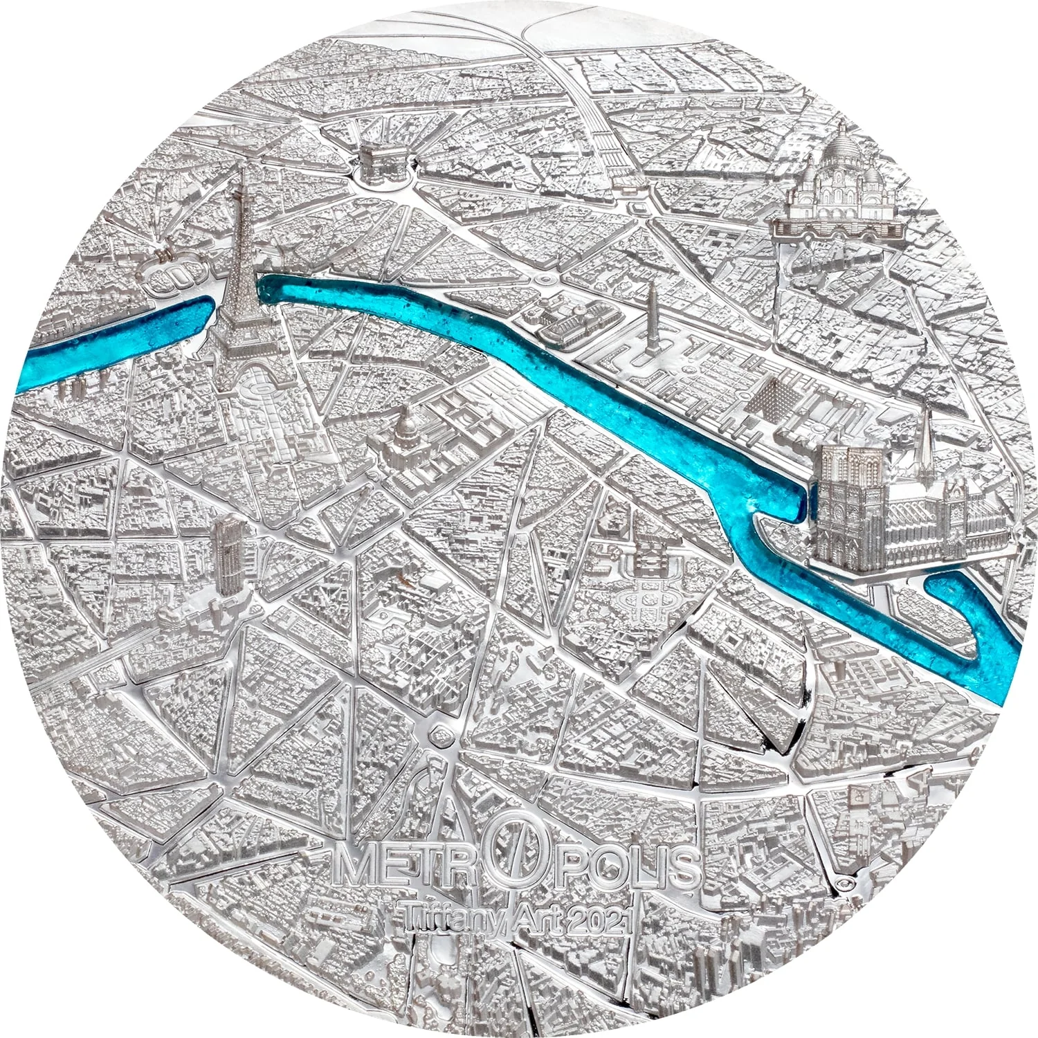 Paris landmarks like the Eiffel Tower, Notre Dame, and the Arc de Triomphe seen from above, with a blue glass Seine river.