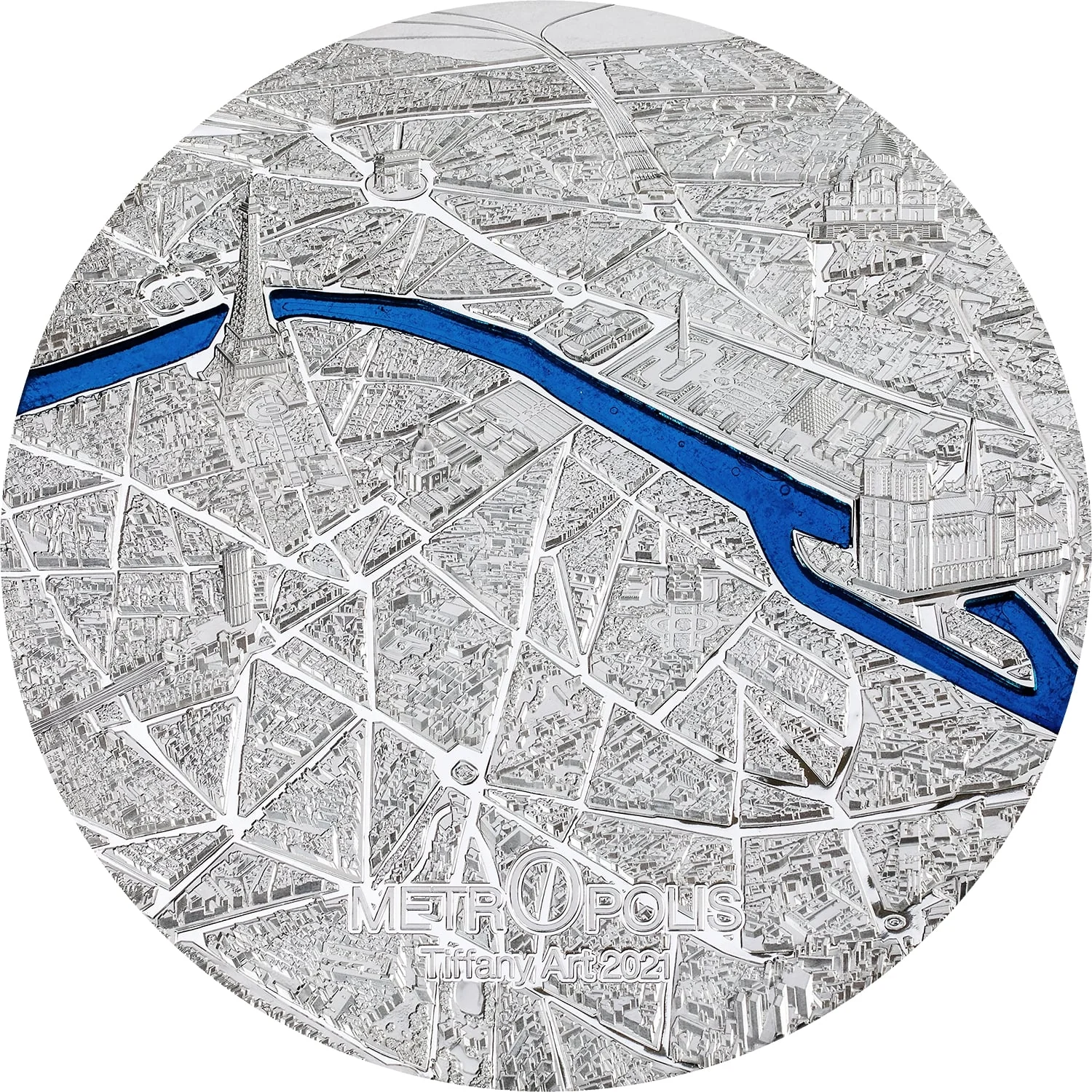 Paris landmarks like the Eiffel Tower, Notre Dame, and the Arc de Triomphe seen from above, with a blue glass Seine river.