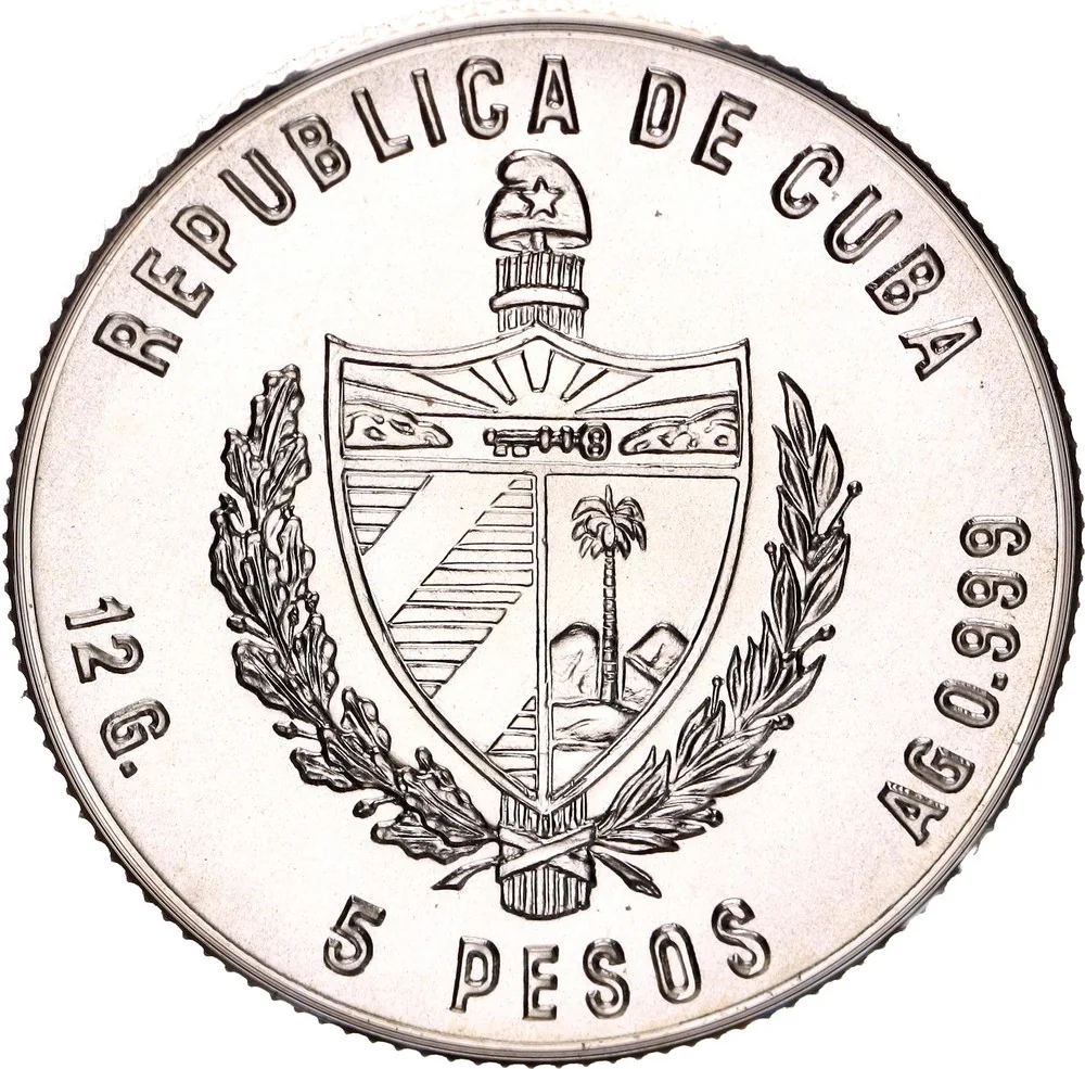 Cuban coat of arms with country name above, face value below, and weight/fineness on the sides.