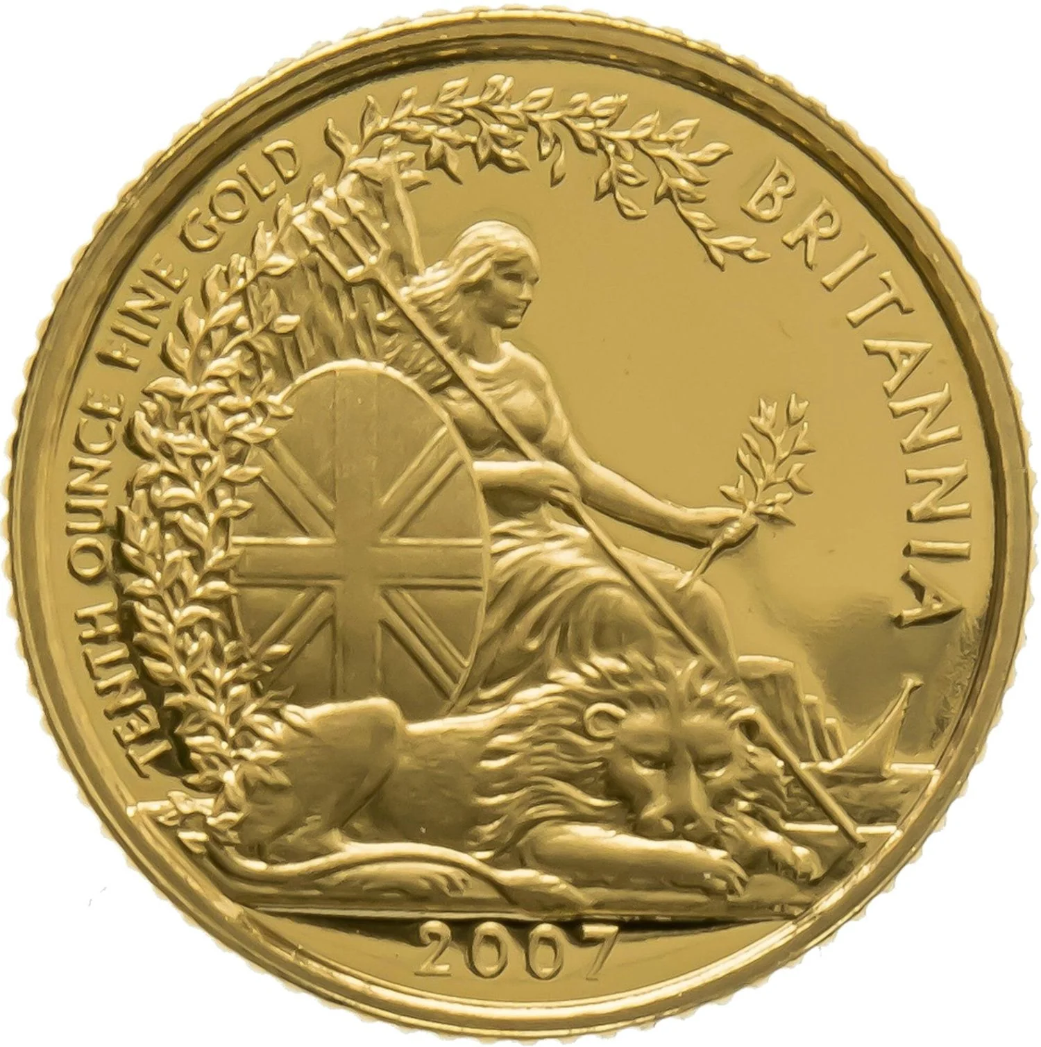 Britannia seated, facing right, holding a trident and olive sprig, with a Union Jack shield and a lion at her feet.