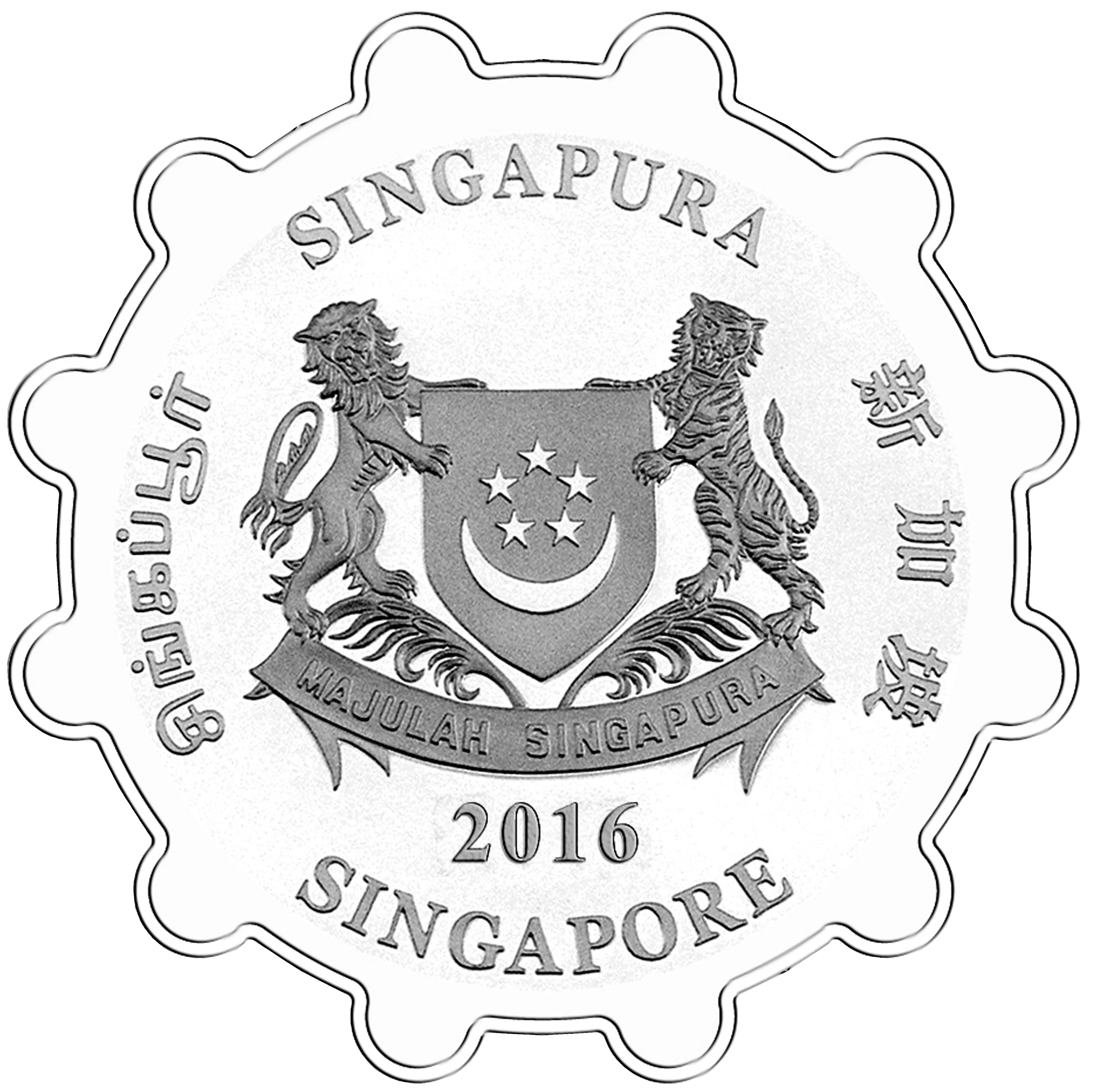 Emblem with date; 'Singapore' encircles it in English, Tamil, Chinese, and Malay.