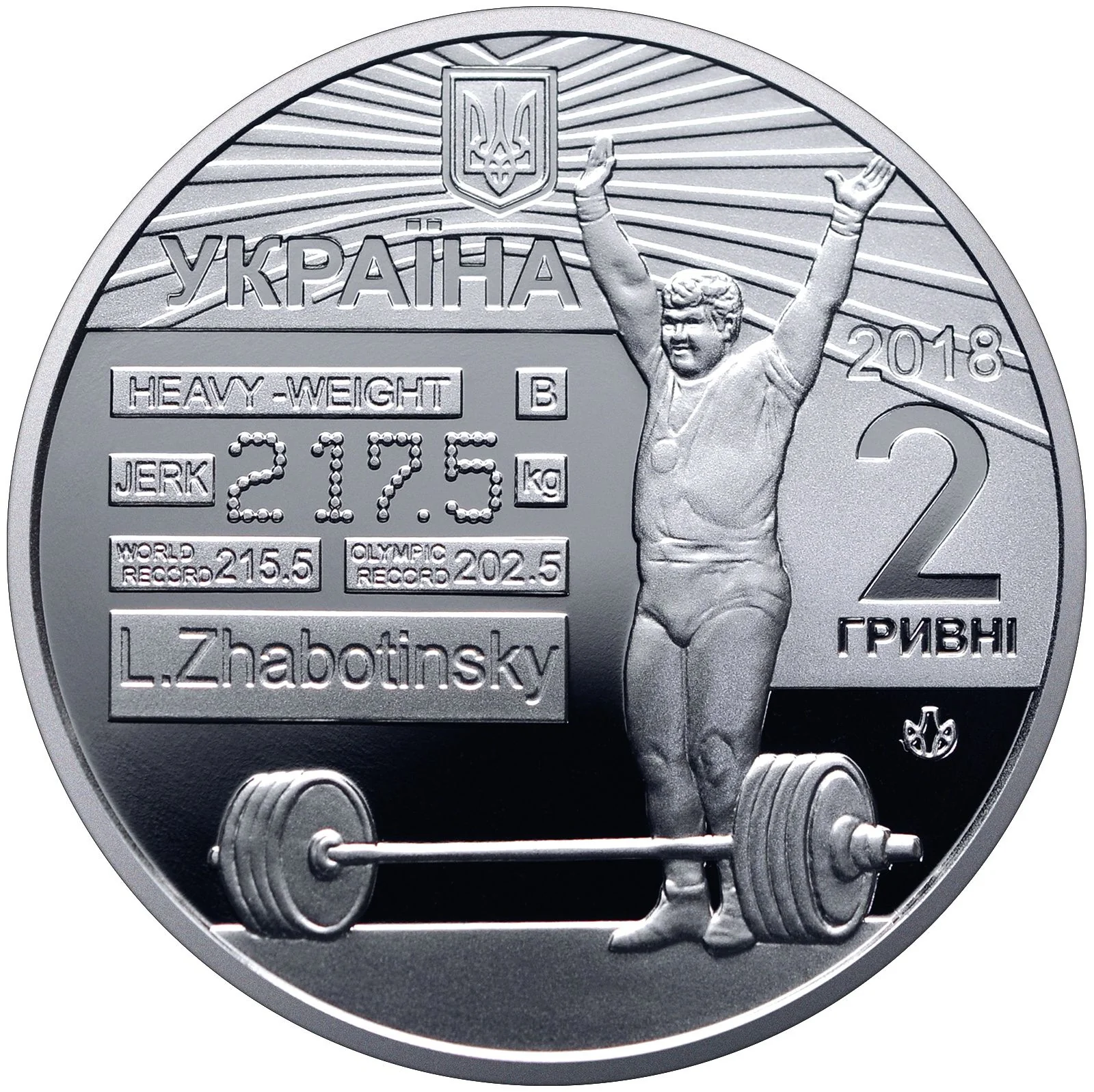Ukraine’s small coat of arms and the word "УКРАЇНА" are above a victorious weightlifter with raised hands beside a barbell. To the left, a stylized scoreboard shows Olympic and world records. To the right are the issue year, face value (2018/2 ГРИВНІ), and the NBU mint mark below.