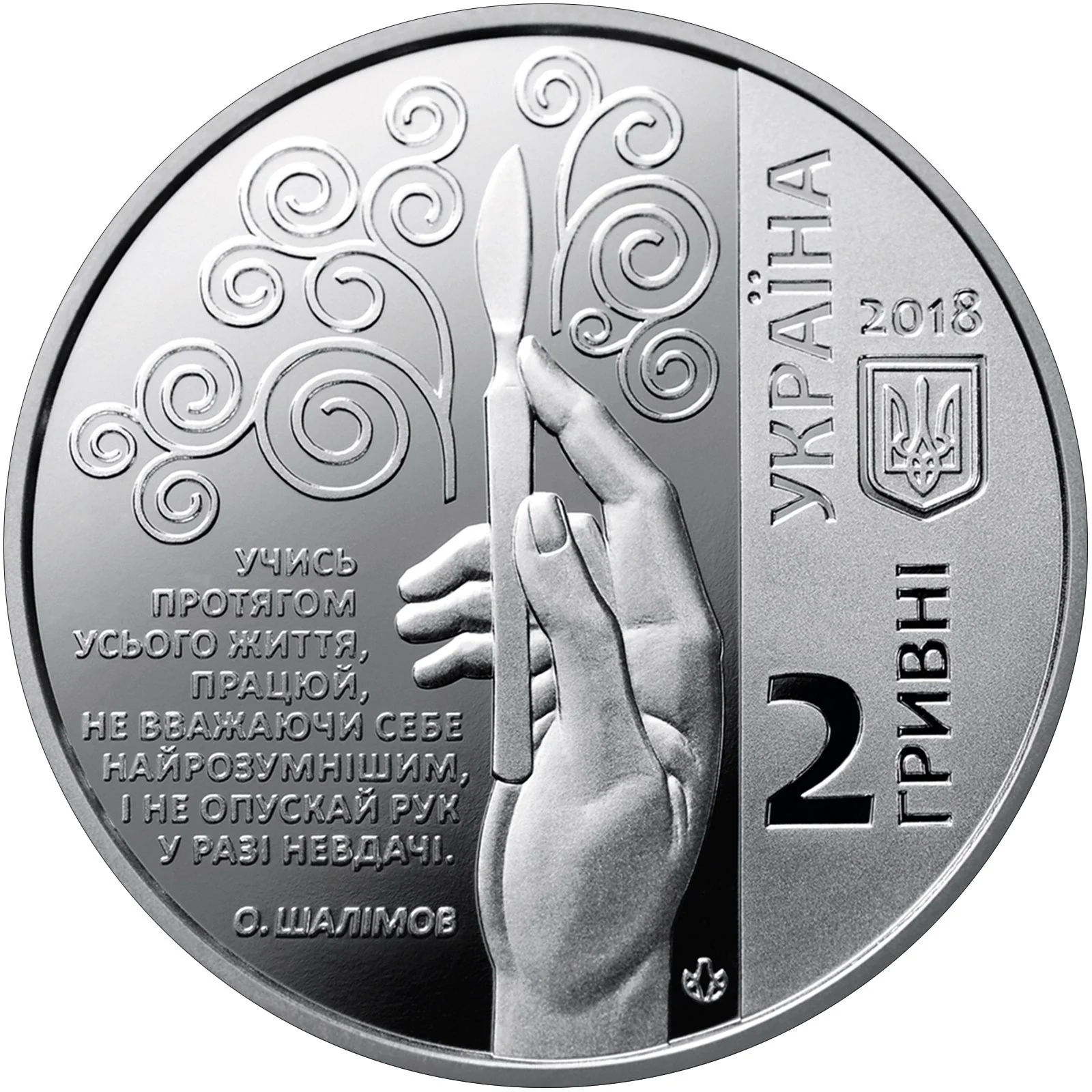 The right side features Ukraine's small coat of arms with the issue year 2018 above it. To the left are the vertical inscriptions "УКРАЇНА" and "2 ГРИВНІ". The central design on a smooth background shows a surgeon's hand encircled by a "tree of life" and the text: "УЧИСЬ/ ПРОТЯГОМ/ УСЬОГО ЖИТТЯ,/ ПРАЦЮЙ,/ НЕ ВВАЖАЮЧИ СЕБЕ/ НАЙРОЗУМНІШИМ,/ І НЕ ОПУСКАЙ РУК/ У РАЗІ НЕВДАЧІ/ О. ШАЛІМОВ". The mint mark of the NBU's Banknote Printing and Minting Works is at the bottom.