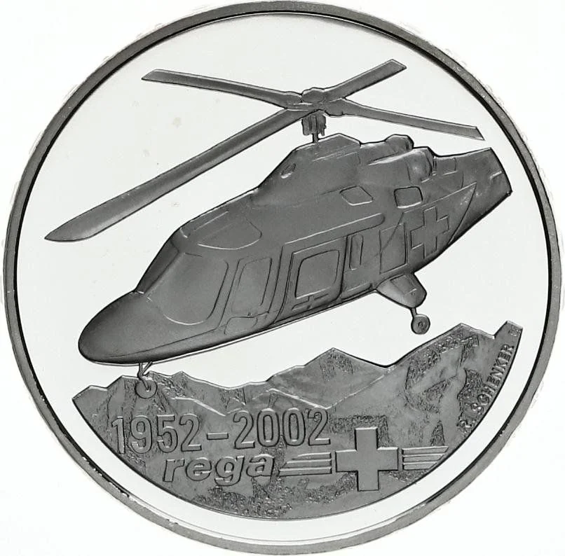 Helicopter propeller from above, with concentric circles. Swiss cross left. Text vertical and horizontal.