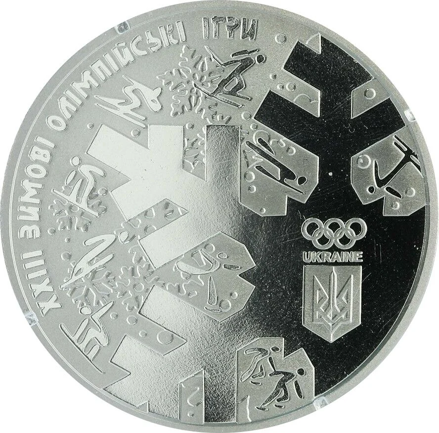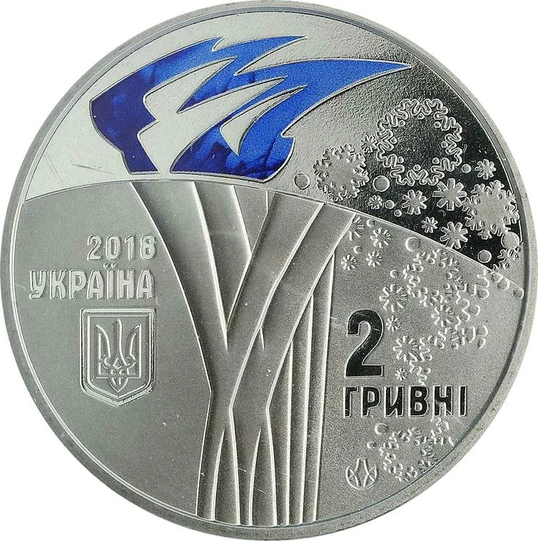 A stylized Olympic torch, forming the Roman numeral XXІІІ, burns with a colored flame. To the left is Ukraine's small coat of arms with "УКРАЇНА" and the year 2018 above it. To the right, amid snowflakes, is the face value "2 ГРИВНІ" and below it, the mint mark.
