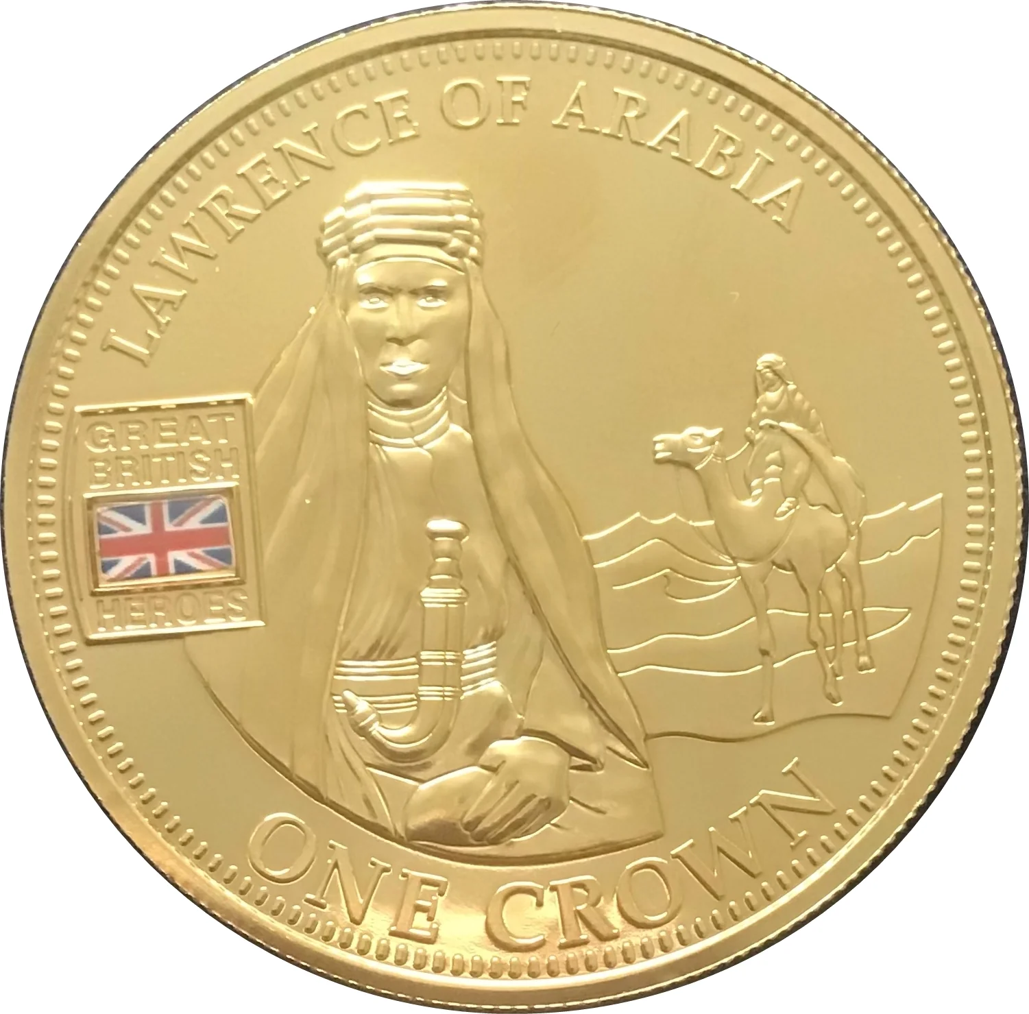 Portrait of Lawrence of Arabia on a camel with a colored flag.