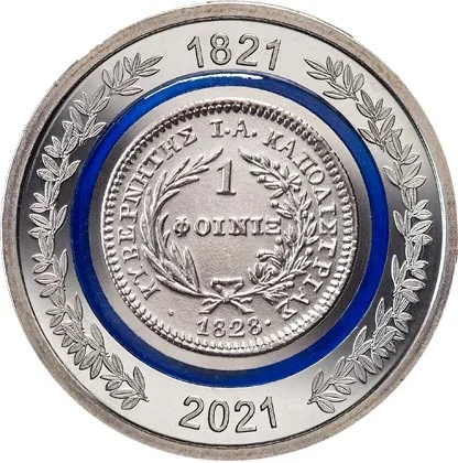 The silver phoenix reverse shows the bird with outspread wings gazing toward the Cross and Holy Spirit rays, encircled by “ΕΛΛΗΝΙΚΗ ΠΟΛΙΤΕΙΑ.” Below, the letter-numerals «αωκα΄» denote the year 1821.
