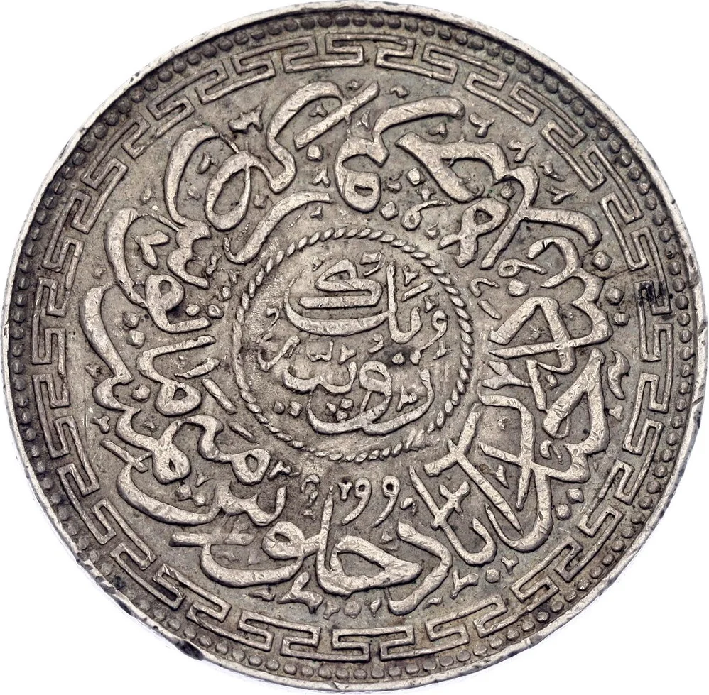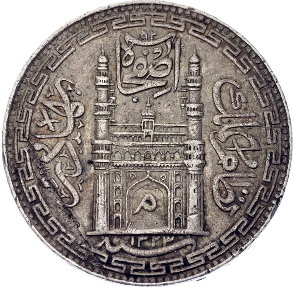 CharMinar gateway legend: Asaf Jah (top), Bahadur (left), Nizam Al-Mulk (right). Urdu "Mim" (for "Mahbub") in doorway. AH date below.
