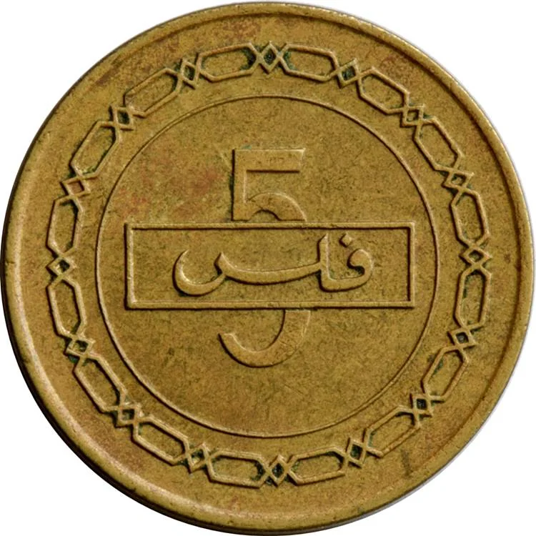 Boxed numeric denomination within a circular chain border. The final letter of "فلس" is stylized Arabic.