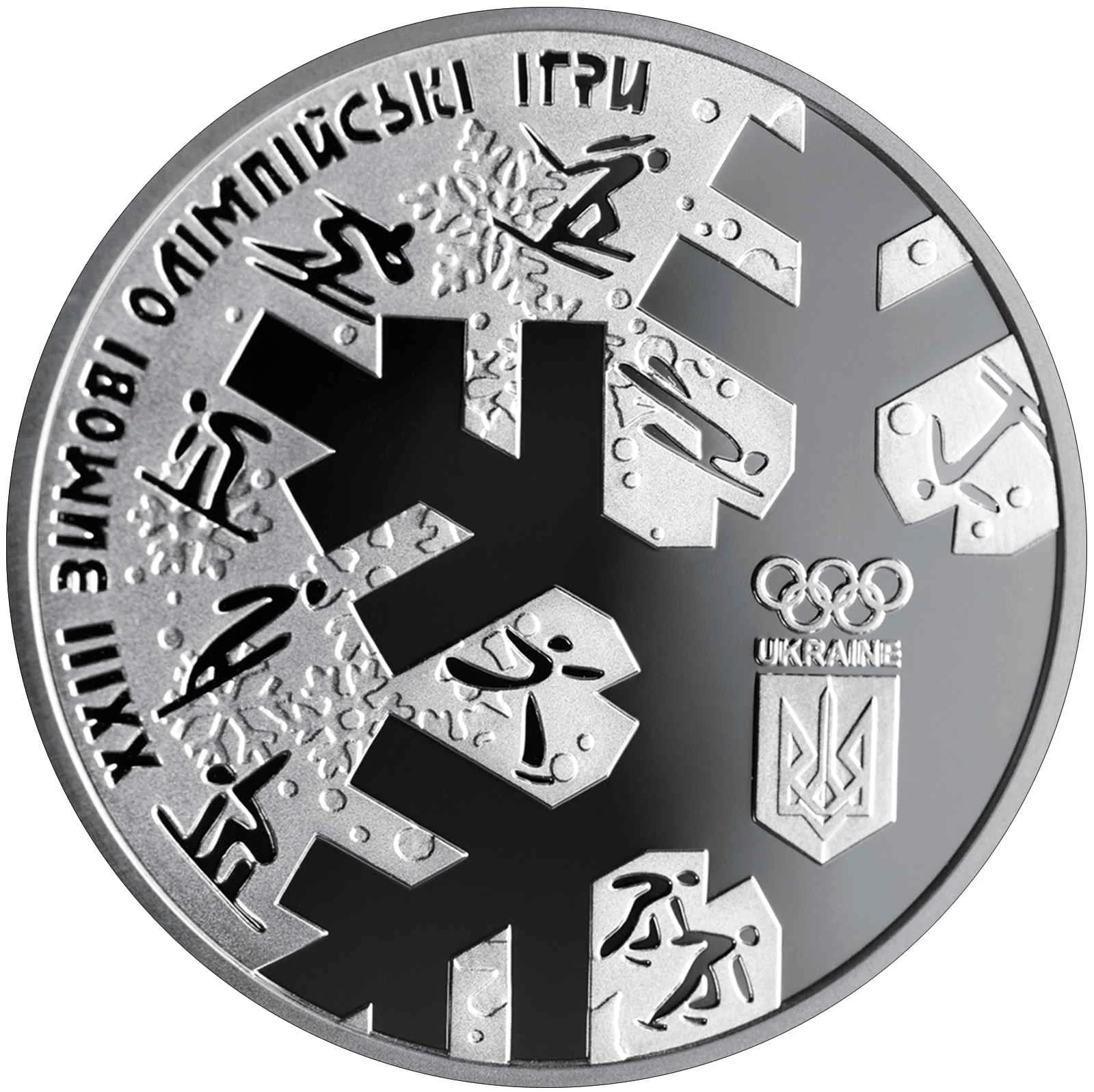 A stylized snowflake with Ukraine's Olympic emblem at its center. Between three arms, matte backgrounds hold winter sports pictograms. To the left, a semicircular inscription reads: "ХХІІІ ЗИМОВІ ОЛІМПІЙСЬКІ ІГРИ (XXIII Winter Olympic Games)."