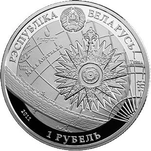 Description: Obverse: Relief of the State Coat of Arms with the circumferential inscription "РЭСПУБЛІКА БЕЛАРУСЬ". Center: Stylized wind rose on a navigation chart. Below: Denomination "1 РУБЕЛЬ" and year of issue.