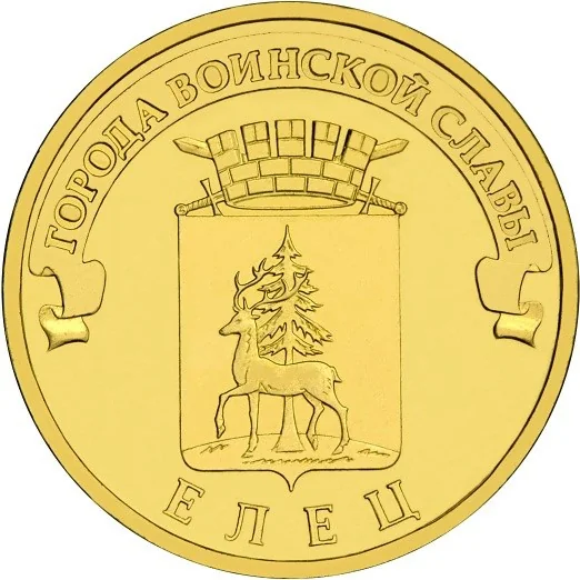 Yelets city coat of arms, above it on a ribbon: "ГОРОДА ВОИНСКОЙ СЛАВЫ", below the rim: "ЕЛЕЦ".