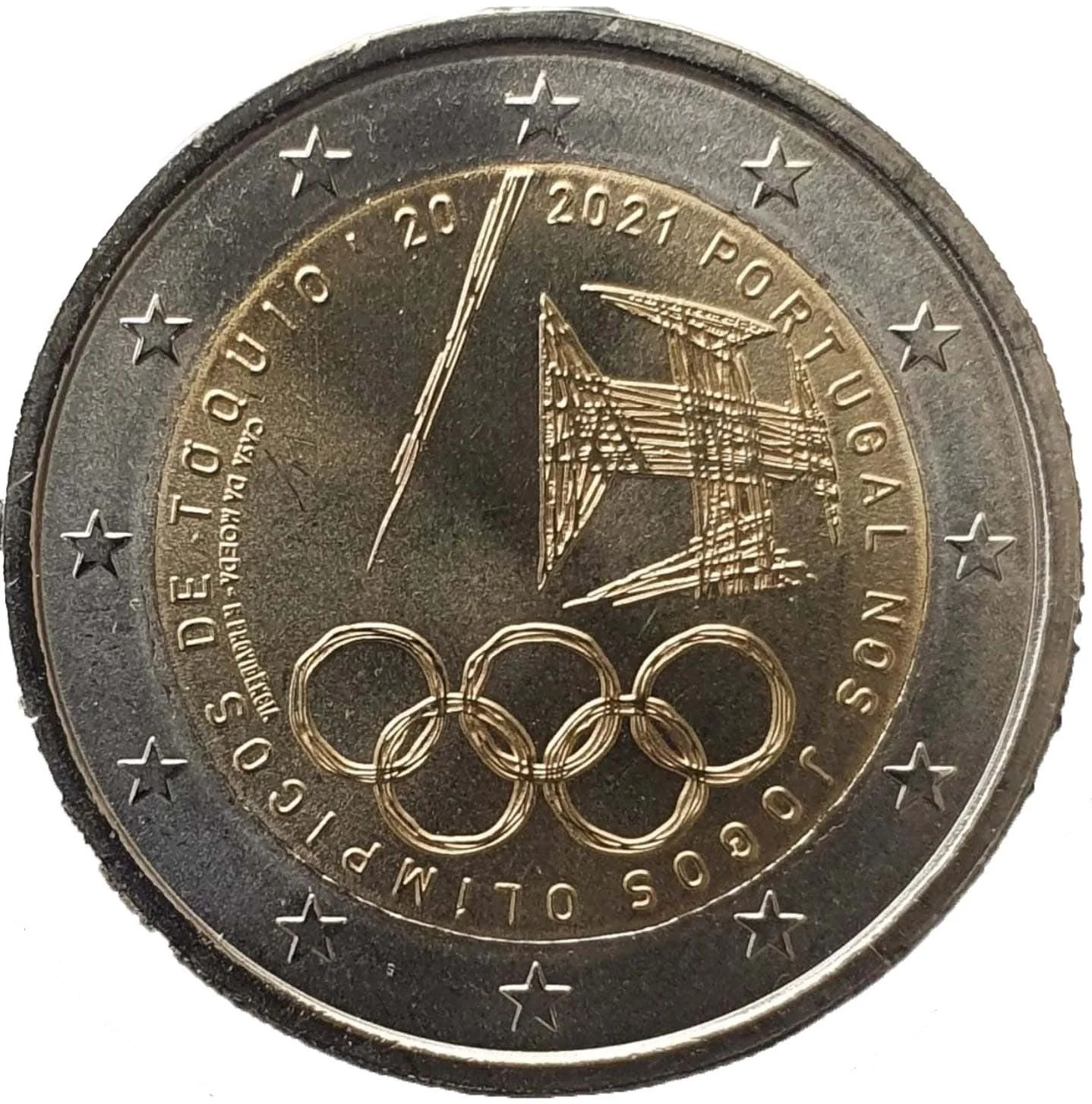 Portugal's Olympic Committee logo, with "Portugal at the 2020 Tokyo Olympics." Engraver and mint names flank it. Surrounded by the EU's 12 stars.