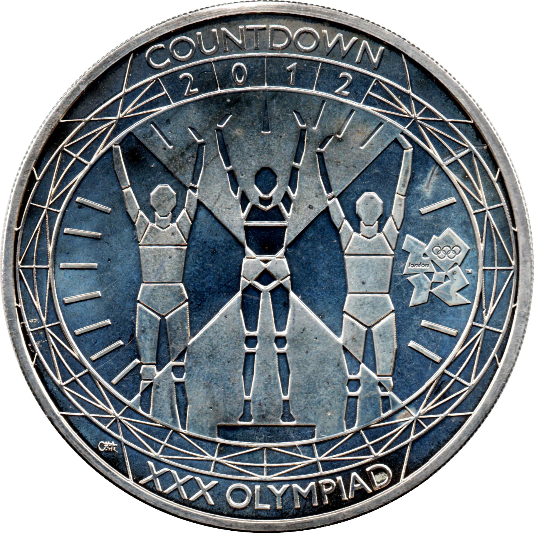 Three stylized athletes on a podium, flanked by a clock and stadium, with the London 2012 logo.