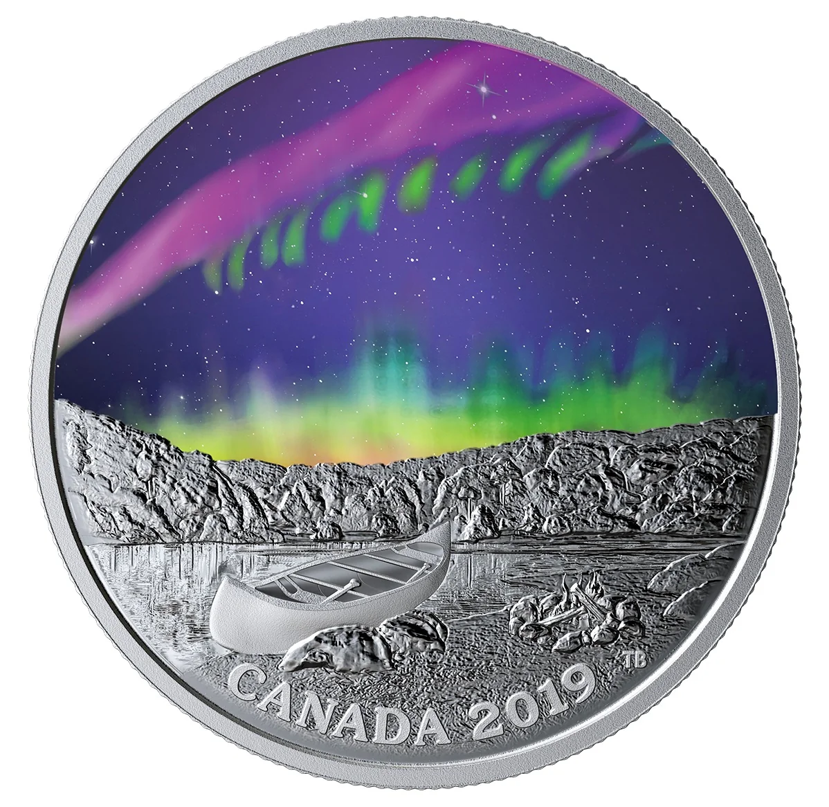 Tony Bianco’s reverse design depicts a fall lakeside campsite under an aurora borealis. A neon accent vividly recreates the “Steve” phenomenon under UV light.
